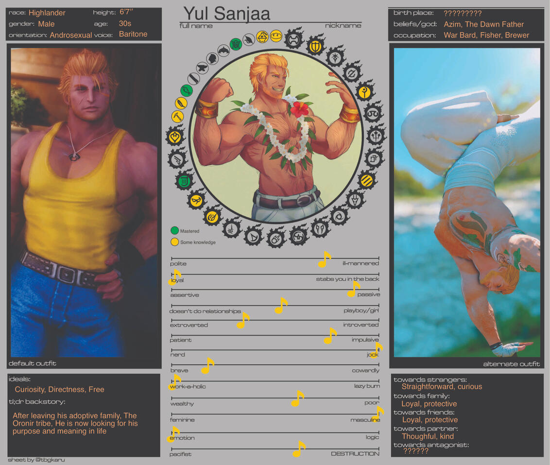 Yul comes from a culture where "toxic masculinity" has been the norm for a long time, affecting individuals regardless of their gender or sex. In his tribe, identities have traditionally been categorized as "Aggressive/Passive/Neutral" rather than being based on gender expression. However, after living in Eorzea and interacting with others, he has come to realize that gender identity is more complex. He is eager to learn, be open-minded, and show respect to others regarding their gender identity.